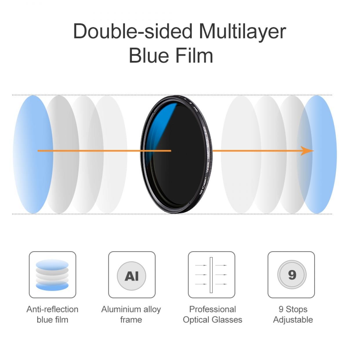 Filter je izdelan iz vrhunskega optičnega stekla, zagotavlja odlično jasnost in zmanjšuje optične popačenja. Z vrtenjem sprednjega elementa omogoča gladek prehod med stopnjami ND, nadomešča več fiksnih filtrov ND in zagotavlja neprimerljivo prilagodljivost pri fotografiranju na prostem. Ultra tanek aluminijast okvir pomaga preprečiti vinjetiranje, tudi pri širokokotnih objektivih, medtem ko njegova trpežna konstrukcija zagotavlja dolgotrajno zanesljivost. Ta VND filter je idealen za fotografiranje pokrajin, portretov z majhno globinsko ostrino, učinkov zameglitve gibanja, snemanje videa v jasni dnevni svetlobi in ustvarjalno delo s počasnim zaklopom, zato je nepogrešljivo orodje za doseganje dosledne osvetlitve in umetniškega nadzora.