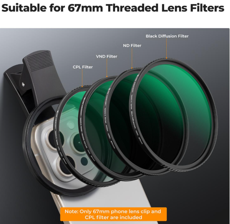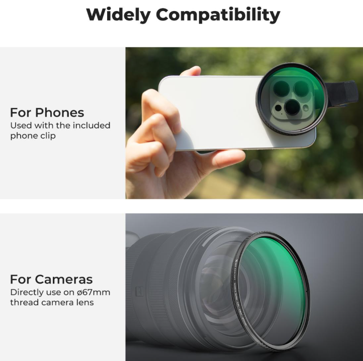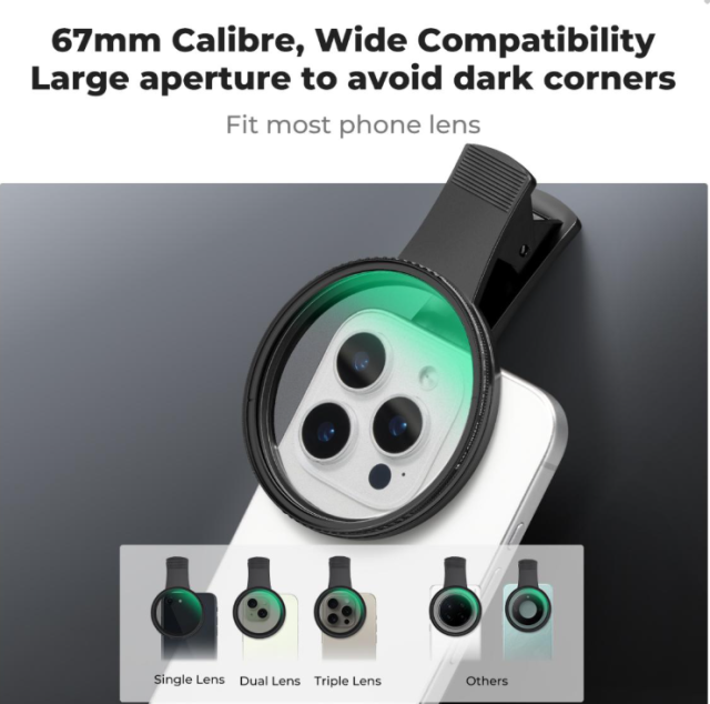 Izboljšajte svojo mobilno fotografijo s kompletom filtrov za kamero telefona K&F 67 mm Clip-on CPL, univerzalnim dodatkom, združljivim z vsemi modeli pametnih telefonov, ki navadne posnetke spremeni v osupljive slike profesionalne kakovosti. Osnova kompleta je vrhunski 67-milimetrski CPL-filter, ki učinkovito zmanjša bleščanje nekovinskih površin, kot sta voda ali steklo, poudari bogastvo naravnih barv v pokrajinah in portretih ter subtilno zmanjša mastni lesk na koži fotografiranih oseb, kar zagotavlja bolj laskav in naraven videz – idealno za avanture na prostem, selfije ali vsakodnevno fotografiranje.