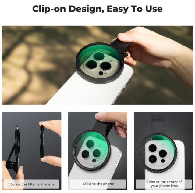 Filter, izdelan za optično odličnost, se ponaša z 18 sloji naprednega protirefleksnega premaza, ki znatno zmanjša odboje in duhove na površini, kar zagotavlja kristalno jasno sliko tudi v svetlih pogojih, hkrati pa ohranja kontrast in podrobnosti slike. Namestitev je enostavna zahvaljujoč inovativni zasnovi zadnjega klipsa, ki filter v nekaj sekundah varno pritrdi neposredno na modul kamere vašega telefona – brez orodja, adapterjev ali modelno specifičnih prilagoditev, kar ga naredi za brezskrbno dopolnilo vaši opremi.
