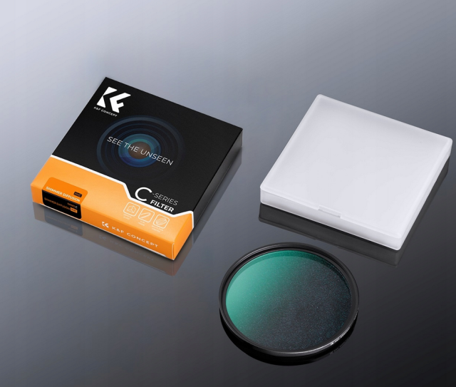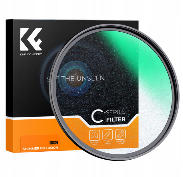 K&F Concept 77 mm C serija Microlight Mirror Shimmer difuzijski filter: HD steklo z nano prevleko, tanek 3,3 mm aluminijast okvir za mehko, sanjsko razpršitev svetlobe in eterične bleščeče učinke.