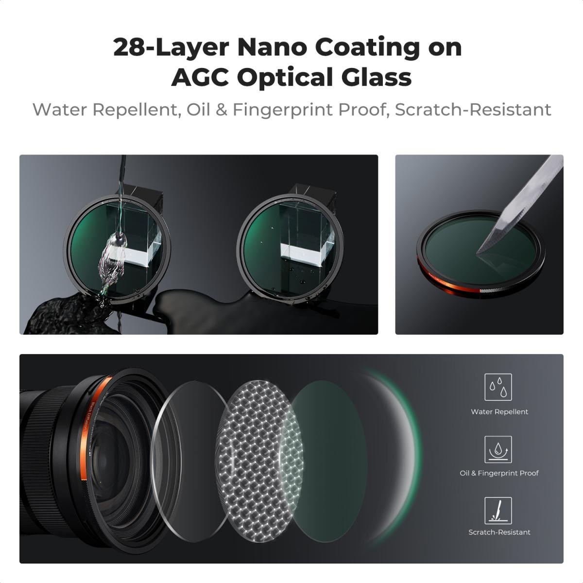 Vsak filter je izdelan iz japonskega stekla AGC in zaščiten z 28-slojnim nano premazom, kar zagotavlja maksimalno jasnost in odpornost proti vodi, olju, praskam, prstnim odtisom in madežem. Tehnologija barvne zvestobe odpravlja neželene barvne odtenke in zagotavlja natančne, realistične rezultate neposredno iz kamere. Ta komplet, ki vključuje kompaktno torbico, primerno za potovanja, ponuja vse, kar potrebujete za fotografiranje pokrajin, portretov, snemanje filmov in vsakodnevno ustvarjalno fotografiranje.