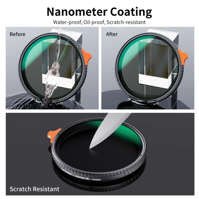 - Premaz Nanotec - Obe strani stekla filtra ND K&F Concept sta večplastno prevlečeni z najnovejšo tehnologijo nanosa Nanotec, zaradi česar so filtri vodoodporni, odporni na olje in praske ter varujejo objektiv fotoaparata pri fotografiranju na prostem.