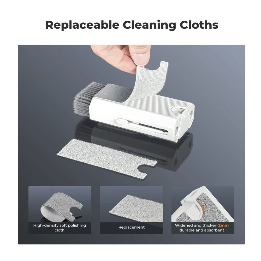 Komplet vsebuje mehko izvlečno krtačo iz vlaken visoke gostote, s katero lahko odstranite prah in umazanijo s tipkovnic, mobilnih naprav in drugih občutljivih površin, ne da bi jih opraskali ali pustili kosmiče. Vključuje tudi krpice iz mikrovlaken za natančno čiščenje zaslonov in površin, ključ za varno odstranjevanje tipk s tipkovnice in držalo za mobilni telefon, ki omogoča udobno oporo med čiščenjem.