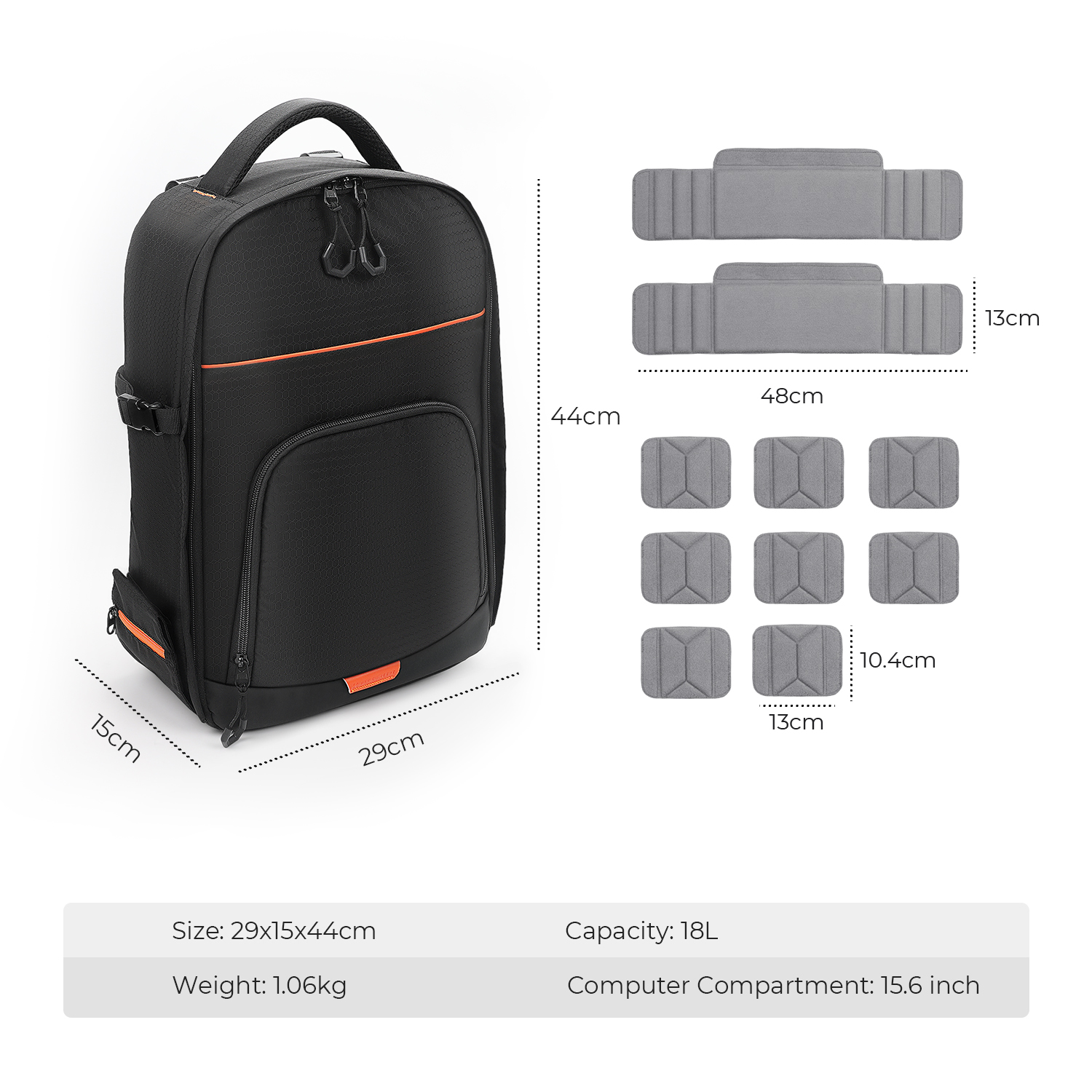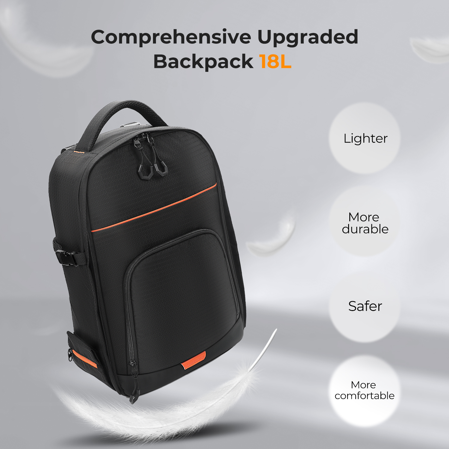 Nahrbtnik 18L. Lahka zasnova, ki upošteva največjo zaščito, varnost in udobje. Sprednje odpiranje, boljša zaščita in zaščita pred krajo, 180° popolno odpiranje, prilagodljiva predelna shranjevalna prostora, razporeditev prostora in organizacija opreme, notranji predmeti so na prvi pogled jasni, maksimalna udobnost organizacije, največ dva aparata in več objektivov, ustreza potrebam različne opreme in se lahko prosto organizira po lastnih željah.