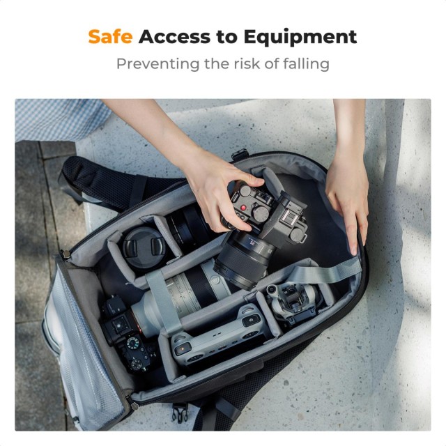 V nahrbtnik lahko spravite 2 kameri + več objektivov + prenosni računalnik + stativ + dodatke. Ima posebne predale za prenosne računalnike do velikosti 15''.
