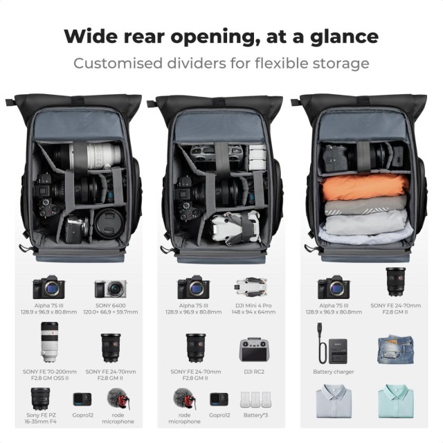 Nahrbtnik K&F Concept 20L Nature Wander 11 v elegantni črni barvi je zasnovan za fotografe, ki zahtevajo hiter dostop, pametno organizacijo in udobje skozi ves dan. Njegova inovativna zasnova z 180° odpiranjem na zadnji strani omogoča, da nahrbtnik v nekaj sekundah popolnoma odprete in vzamete opremo, medtem ko odstranljivi oblazinjeni predelki omogočajo prilagojene konfiguracije za DSLR/brezzrcalne ohišje, objektive in dodatke. Z 4-litrskimi zgornjimi in 2-litrskimi sprednjimi razširljivimi žepi pridobite prilagodljiv prostor za osebne predmete ali dodatne filtre. Poseben 15,6-palčni oblazinjeni predal za prenosni računalnik varuje vašo urejevalno postajo, spodnji trakovi za stativ pa držijo opremo do 50 cm. Več žepov, vključno z dvojnim stranskim dostopom, notranjimi mrežastimi žepi, držali za baterije in žepkom za pomnilniške kartice, omogoča, da imate vse potrebno pri roki. Ergonomski zadnji del z zračnim pretokom, dihalna oblazinjenost in široki ramenski trakovi zagotavljajo prezračevanje in udobje na dolgih pohodih ali mestnih snemanjih, zaradi česar je ta nahrbtnik najboljša kombinacija zaščite, vsestranskosti in potovalne oblikovane zasnove.