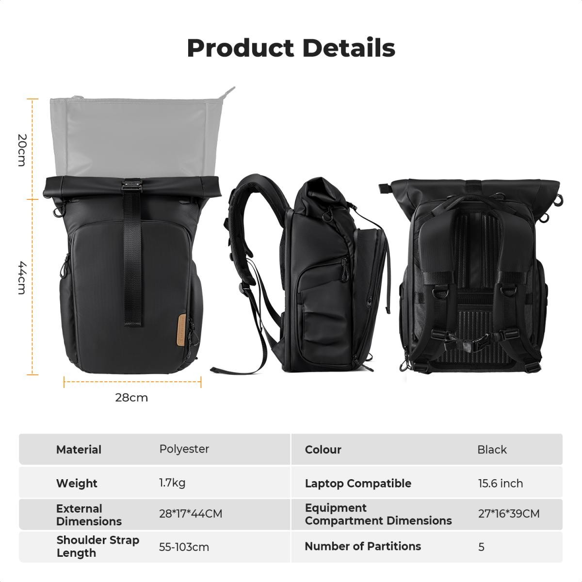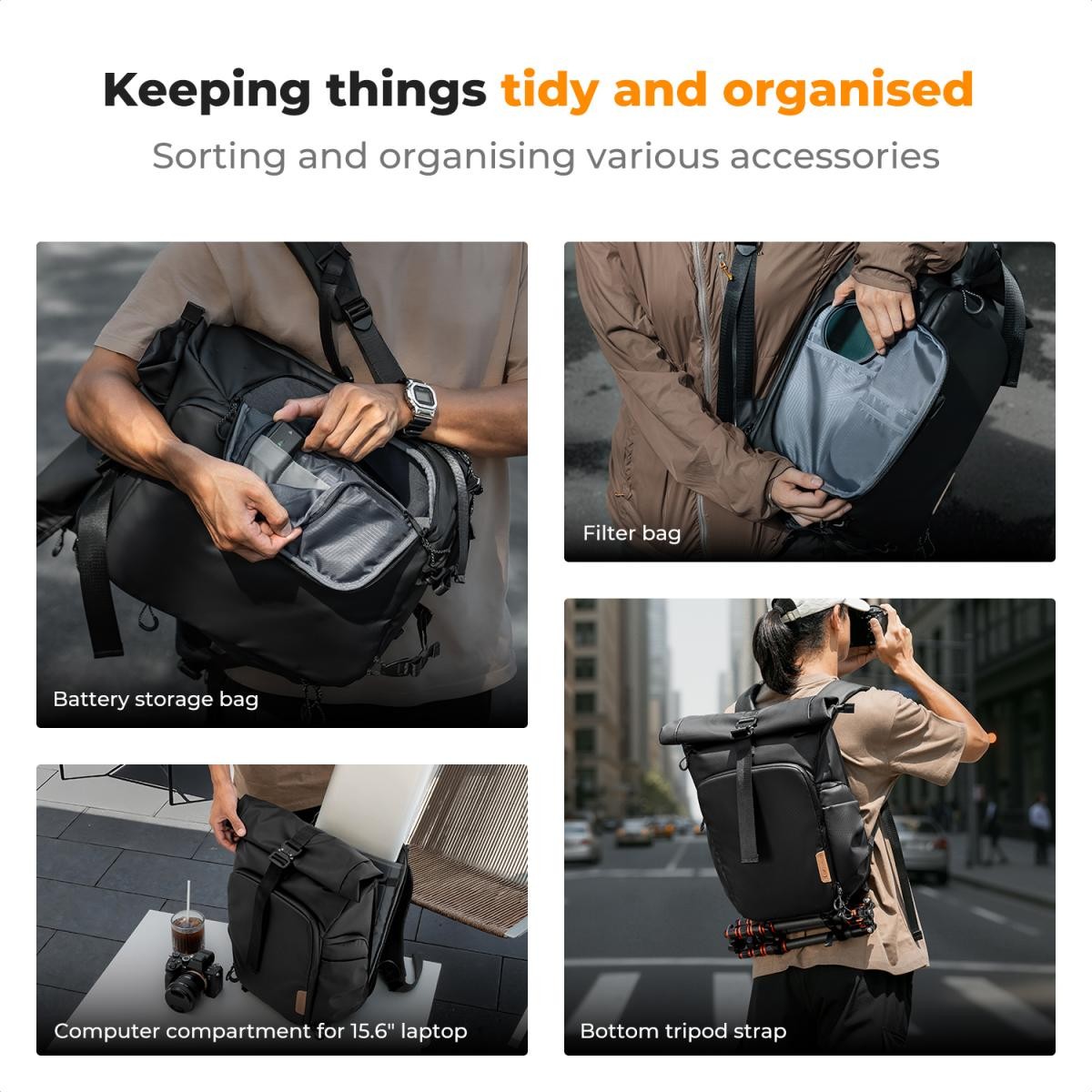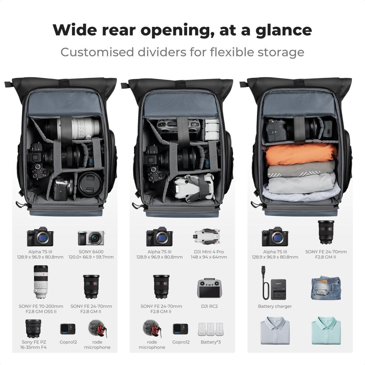 K&F Concept 20L Nature Wander 11 nahrbtnik (črn): torba za fotoaparat z 180° odpiranjem na zadnji strani, prilagodljivimi predelki, žepom za 15,6-palčni prenosni računalnik, razširljivim 6-litrskim prostorom za shranjevanje in trakovi za stativ za udobno celodnevno fotografiranje.