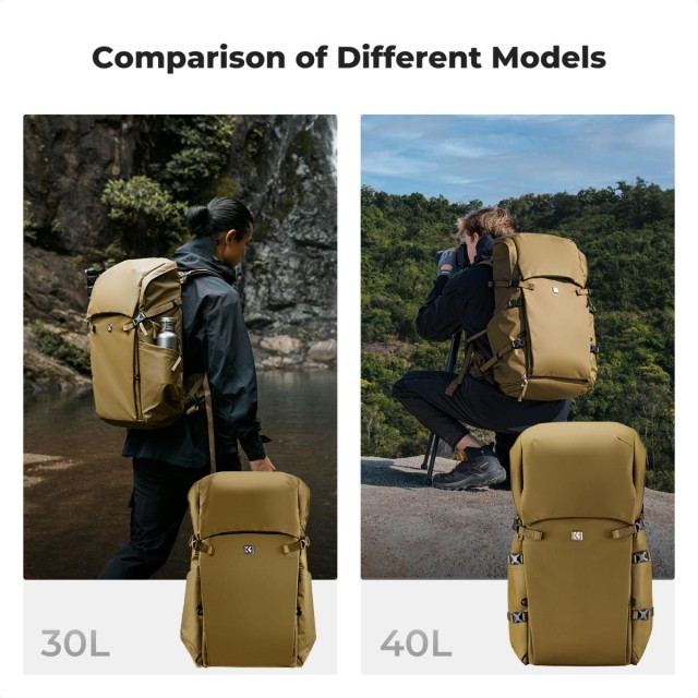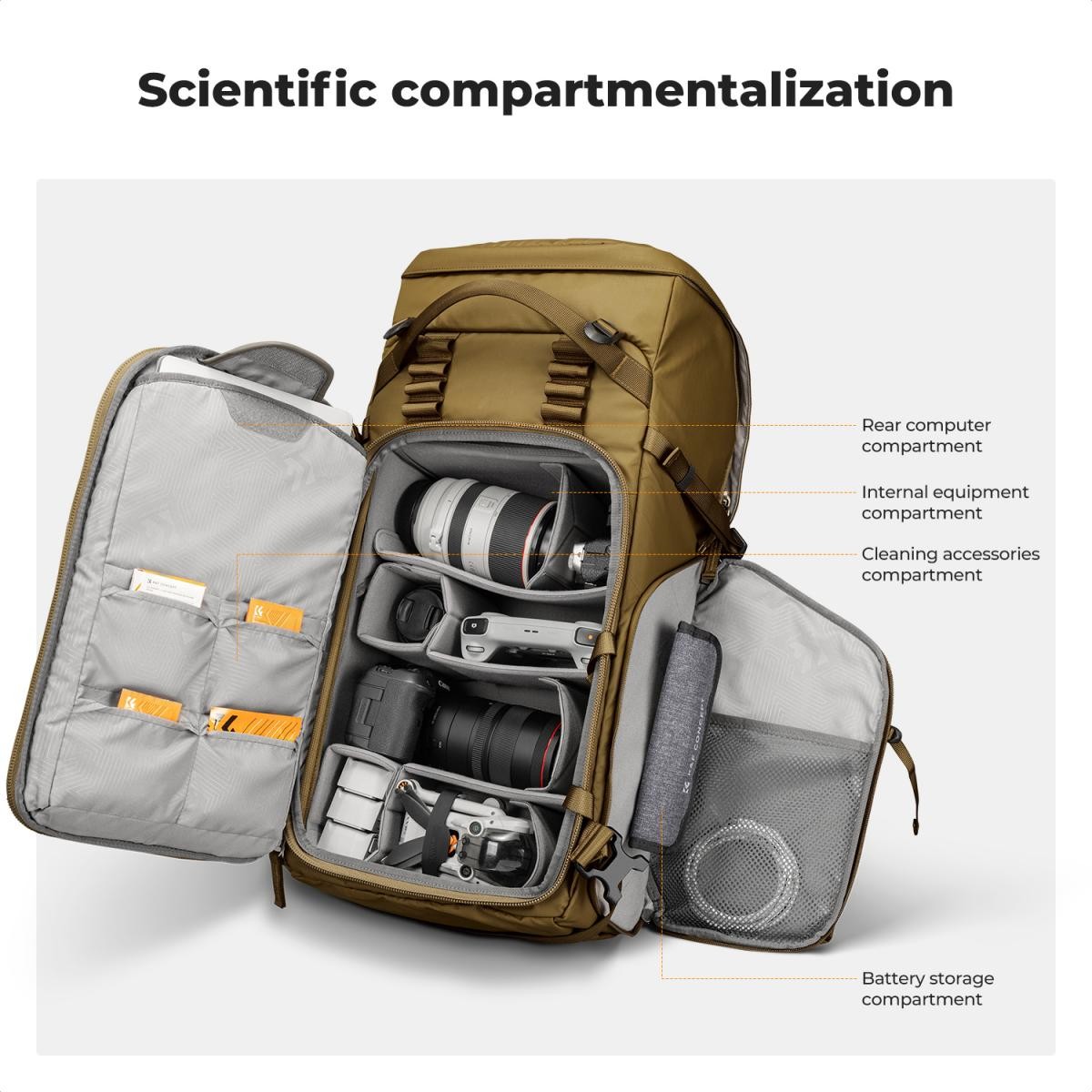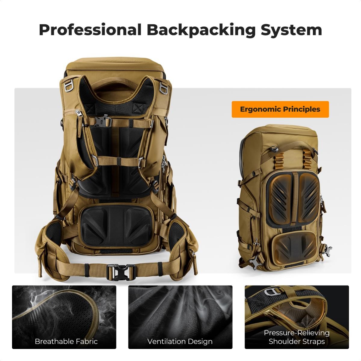 K&F CONCEPT Backpack 40L Star Wander05 (Champagne) je profesionalni nahrbtnik za fotografiranje na prostem in treking, zasnovan za udobje, zaščito in hiter dostop. S svojim ergonomskim sistemom trikratno nastavljivega pasu, vremensko odpornimi materiali in modularnim odstranljivim vložkom za fotoaparat je ta nahrbtnik idealen za fotografe in pustolovce, ki nosijo težko opremo na dolge razdalje.