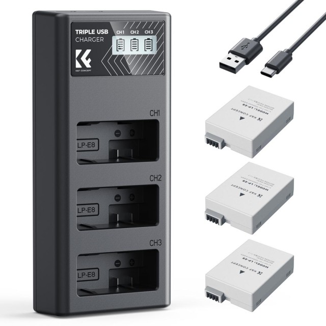 K&F Concept 3-pak baterij za fotoaparate Canon LP-E8 s polnilnikom LCD s 3 režami. Vključuje baterije LP-E8 s kapaciteto 1200 mAh in polnilnik z LCD-zaslonom z dvojnim vhodom Micro USB/Type-C za hitro in varno…