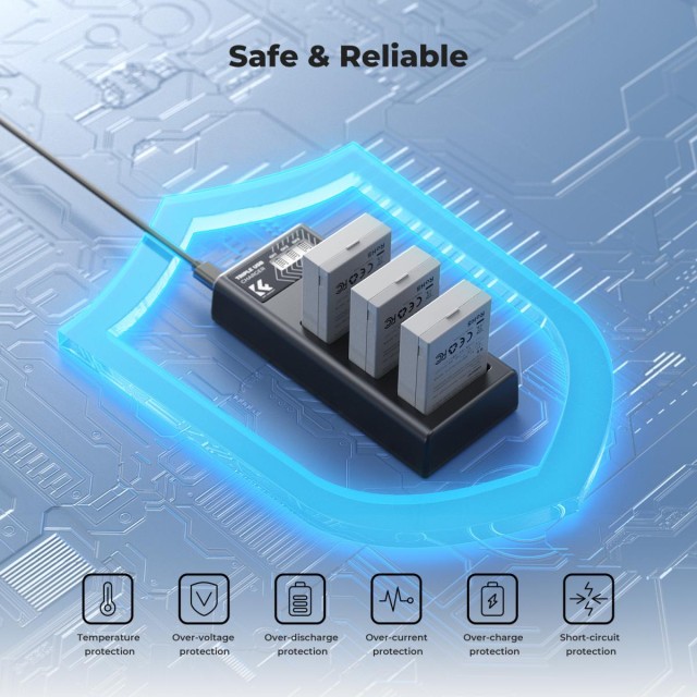 Komplet vključuje polnilnik baterij LCD s 3 režami, ki omogoča hkratno polnjenje treh baterij, pri čemer na jasnem LCD-zaslonu prikazuje stanje polnjenja vsake baterije. Polnilnik podpira dvojni vhod prek Micro USB ali Type-C (5 V/2,1 A), zaradi česar je združljiv z napajalniki za steno, avtomobilskimi polnilniki, prenosnimi računalniki in drugimi viri napajanja USB. Z uporabo vhoda Type-C se lahko vse tri baterije v celoti napolnijo v približno 3,8 urah.