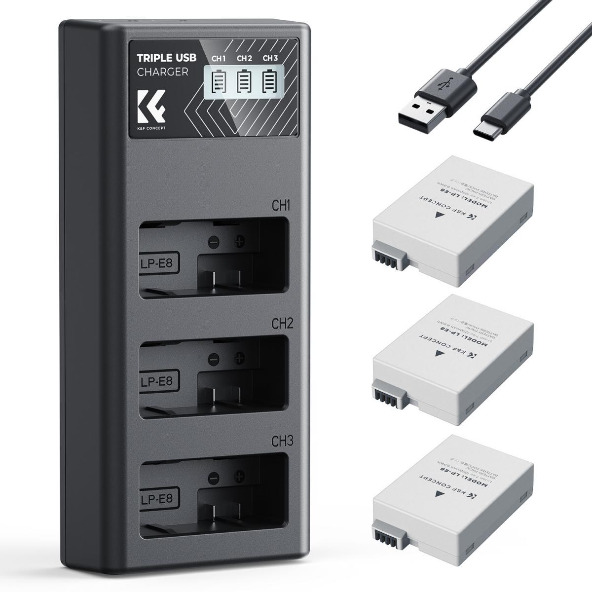 K&F Concept 3-pak baterij za fotoaparate Canon LP-E8 s polnilnikom LCD s 3 režami. Vključuje baterije LP-E8 s kapaciteto 1200 mAh in polnilnik z LCD-zaslonom z dvojnim vhodom Micro USB/Type-C za hitro in varno polnjenje.