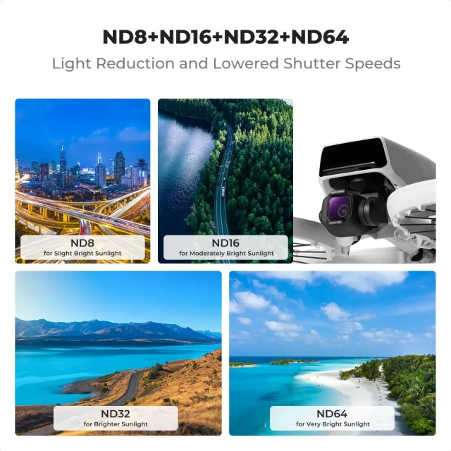 - * 【Zmanjšanje svetlobe in uravnotežena osvetlitev】Filter ND8 ND16 ND32 ND64 zmanjša osvetlitev za 3 do 6 stopinj, kar je idealno za različne svetlobne razmere, hkrati pa naravno izboljša podrobnosti slike. Med dinamičnimi dejavnostmi na prostem blokira ustrezno vrednost svetlobe, ki pade na akcijska kamero, da se parametri kamere prilagodijo in doseže učinek zamegljenosti gibanja