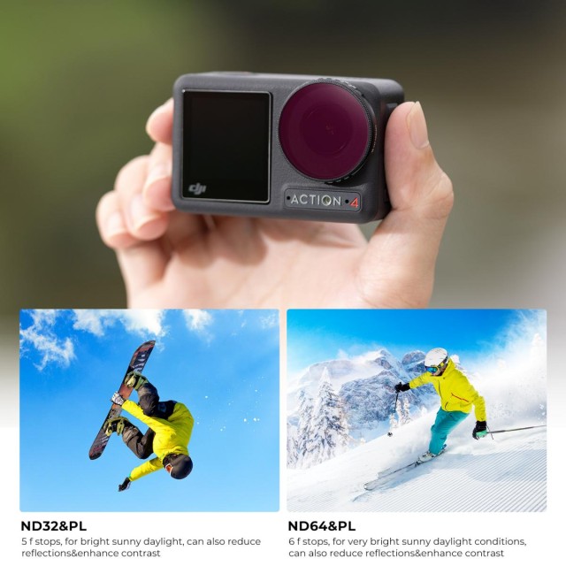 Komplet filtrov ND K&F Concept za Osmo Action 4 vključuje filtre ND8&PL, ND16&PL, ND32&PL in ND64&PL, ki upočasnijo hitrost zaklopa za 3/4/5/6 zaslonk in zmanjšajo osvetlitev brez kromatske aberacije. Filtri so izdelani iz visokokakovostnega japonskega stekla AGC z 28-slojnim nanopovlakom, zato so vodoodporni, odporni na praske, plesen in olje ter zagotavljajo slike visoke ločljivosti. Ultralahki filtri z okvirjem iz zlitine letalskega aluminija tehtajo le po 0,5 g, kar zagotavlja, da ne vplivajo na delovanje fotoaparata, njihova počrnjena površina pa zmanjšuje odseve. Zasnova s hitrim sproščanjem omogoča enostavno montažo ter zagotavlja robustno in trdno prileganje kardanskim kameram.