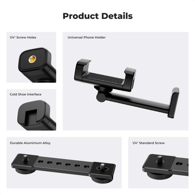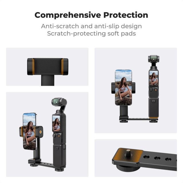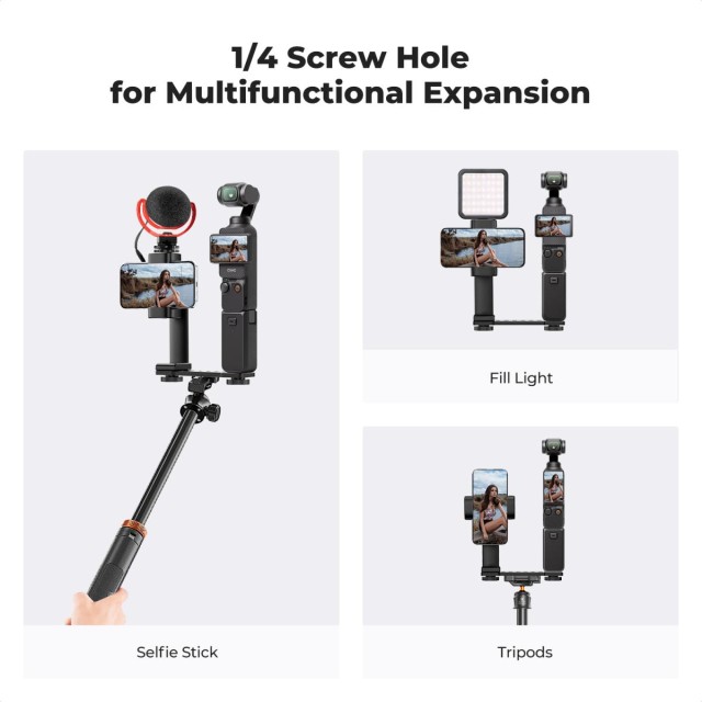 Izboljšajte svojo izkušnjo snemanja z DJI Osmo Pocket 3 s stojalom za mobilni telefon K&F Concept, ki je zasnovano za nemoteno povezovanje pametnega telefona za večji zaslon in natančnejši nadzor nad kamero. Povezovalna podlaga je izdelana iz CNC-obdelane, anodizirane aluminijeve zlitine, medtem ko je sponka za telefon izdelana iz visokokakovostne PC+ABS plastike in nerjavečega jekla, kar zagotavlja varno in stabilno povezavo. Vsestranska zasnova omogoča 360° vodoravno in navpično vrtenje ter 180° nastavitev naklona, tako da lahko posnamete posnetke iz praktično katerega koli kota. Njegove bogate možnosti razširitve vključujejo šest dodatnih 1/4" vrat na podlagi, kar skupaj znaša osem, ter hladno stopalko in 1/4" vrata na samem telefonu. Enostavno pritrdite stative, palice za selfije, mikrofone ali dodatne luči, da izboljšate svojo izkušnjo snemanja. Idealno za ustvarjalce, ki zahtevajo prilagodljivost, stabilnost in profesionalne možnosti nastavitve v enem kompaktnem dodatku.