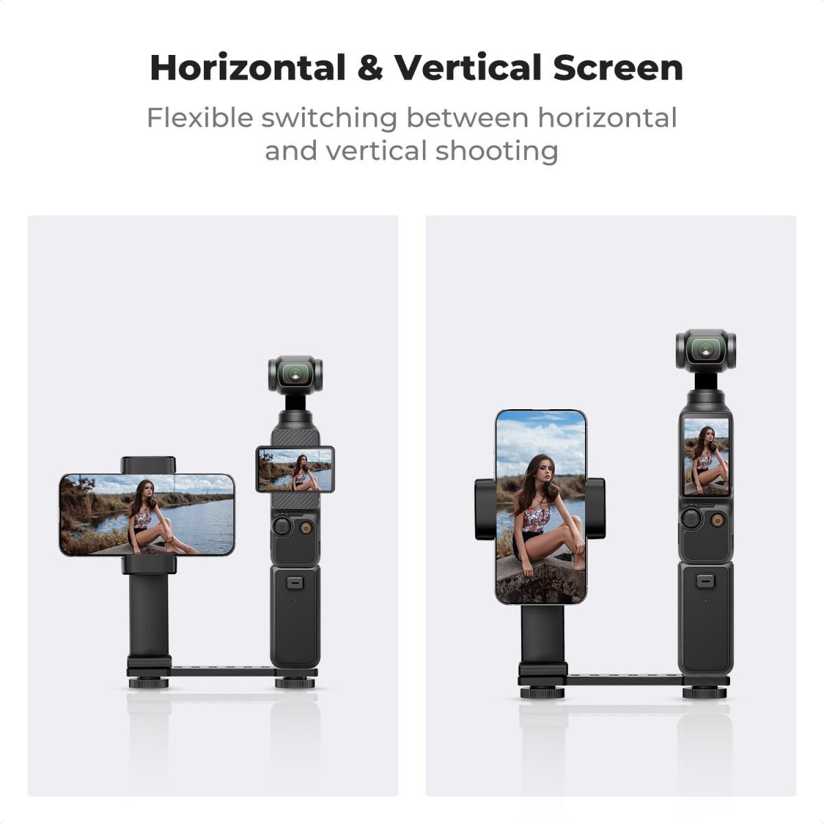 Stojalo za mobilni telefon K&F Concept DJI Osmo Pocket 3 je idealna dodatna oprema za vaš Pocket 3, ki omogoča nemoteno integracijo vašega pametnega telefona za večji zaslon in izboljšano upravljanje kamere. Izdelano je iz vrhunske aluminijeve zlitine in trpežne PC+ABS plastike z nerjavečim jeklom, kar zagotavlja stabilno in varno povezavo. Z vsestranskim 360° vodoravnim in navpičnim vrtenjem, 180° nastavitvijo naklona in več možnostmi pritrditve, vključno s hladnimi čevlji in 1/4" vrati, je idealen za stative, luči, mikrofone in še več.