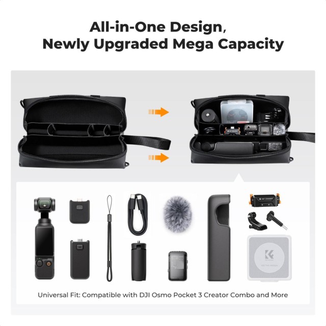Torba K&F za DJI Osmo Pocket 3. Svojo opremo varno in stilsko shranite v uradni torbi DJI Osmo Pocket 3. Ta elegantna torba, zasnovana posebej za Creator Combo, ponuja varno shranjevanje kamere in nujnih dodatkov.