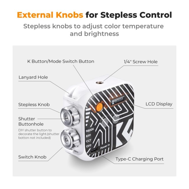 - * 【Več načinov namestitve】Izdelek ima dve luknji za vijaka 1/4", ki ju lahko namestite na svetlobno stojalo. V kombinaciji z opremljenim adapterjem za hladno podnožje ga lahko namestite na fotoaparat. Na zadnji strani izdelka so magneti, ki jih lahko pritrdite na kovinske predmete. Poleg tega je lupina izdelka opremljena tudi z luknjo za vrvico. Z vrvico ga lahko obesite na zapestje in ga prenašate ali pa ga obesite na kljuko za shranjevanje.