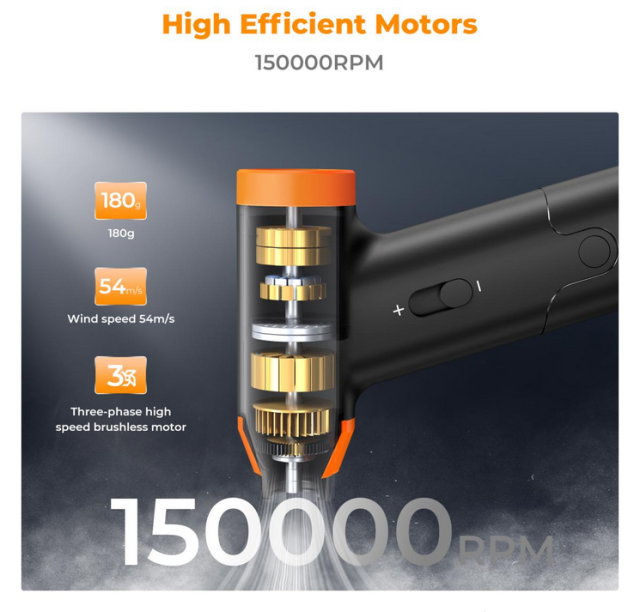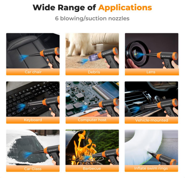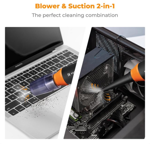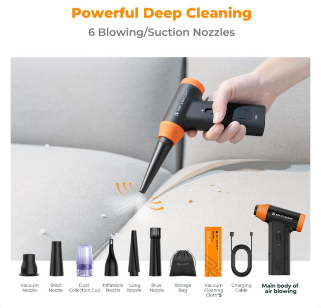Električni komplet za pihanje zraka za čiščenje K&F Concept je inovativna alternativa običajnim pločevinkam s stisnjenim zrakom, ki ponuja zmogljivo delovanje za večkratno uporabo za različne potrebe čiščenja. Ta zračni pihalnik, zasnovan z brezkrtačnim motorjem, lahko ustvari največjo hitrost vetra 54 m/s in silo vetra do 180 G, kar vam omogoča odstranitev 99 % prahu v samo eni minuti.