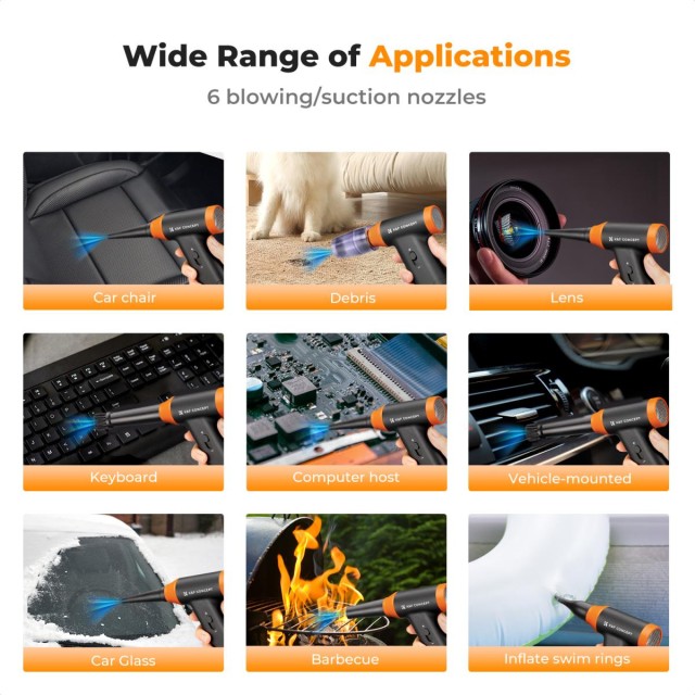 Komplet za pihanje zraka je zasnovan za vsestransko uporabo in vključuje več šob in krtač ter krpe za sesanje, zaradi česar je primeren za čiščenje prenosnih računalnikov, notranjosti avtomobilov, sedežev in površin v domu. Poleg uporabe v notranjih prostorih je primeren tudi za dejavnosti na prostem, kot so pihanje ognja, napihovanje plavalnih obročev, sušenje las ali dlake hišnih ljubljenčkov ter odstranjevanje snega ali listja z vozil.