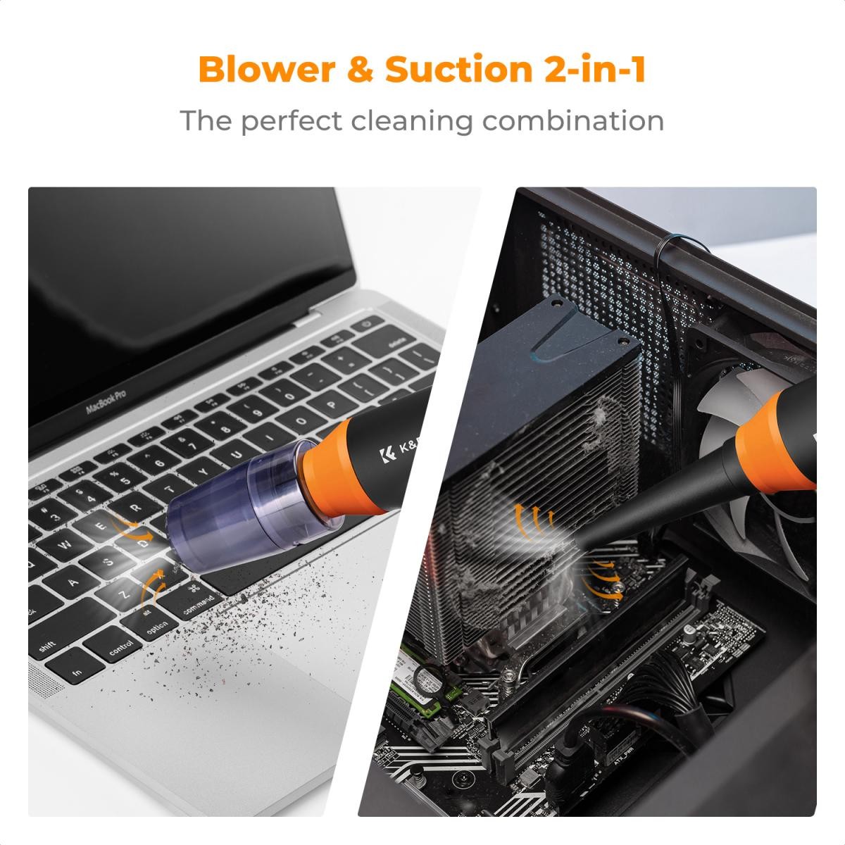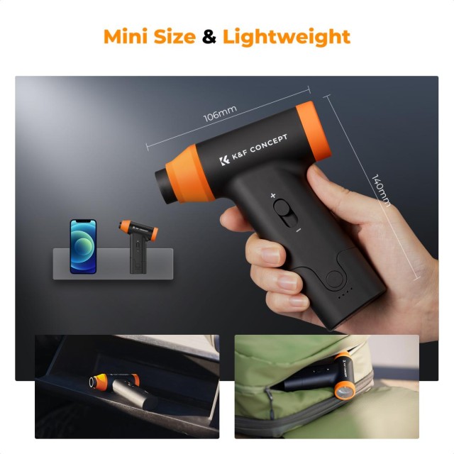 Električni komplet za čiščenje z zrakom K&F CONCEPT je kompakten, a zmogljiv polnilni pihalnik z zrakom, ki ima brezkrtačni motor z visoko hitrostjo, nastavljiv pretok zraka in več nastavkov za vsestransko čiščenje. Zasnovan je kot okolju prijazna alternativa za enkratne pločevinke s stisnjenim zrakom in zagotavlja močan, natančen pretok zraka za temeljito čiščenje elektronike, vozil in drugih predmetov.