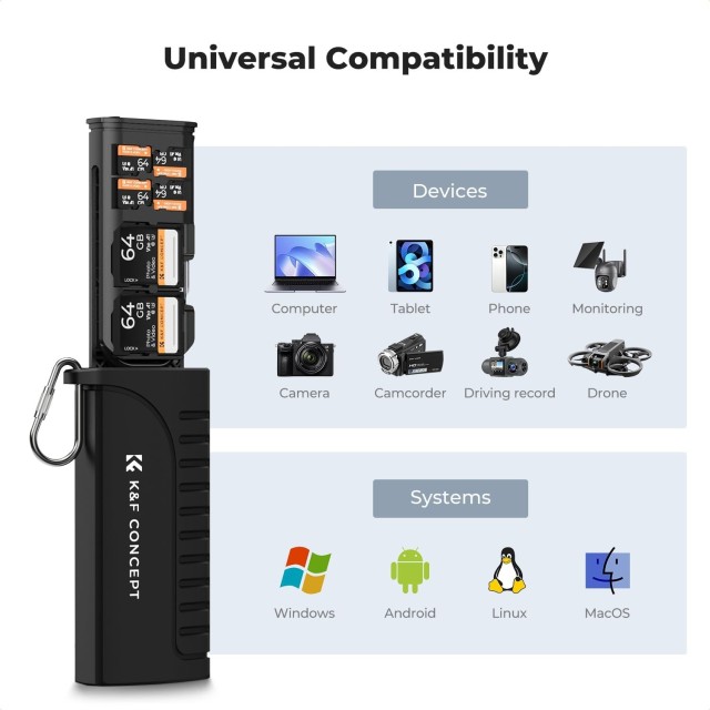 K&F CONCEPT High-Speed Flash Card Box je kompaktna, zaščitna rešitev za shranjevanje, zasnovana za varno shranjevanje SD kartic, mikro SD (TF) kartic in Nano SIM kartic. Zaradi trpežne konstrukcije in univerzalne združljivosti omogoča urejeno shranjevanje in enostaven dostop do pomembnih pomnilniških kartic, hkrati pa ponuja priročne možnosti povezovanja USB-C in USB-A.