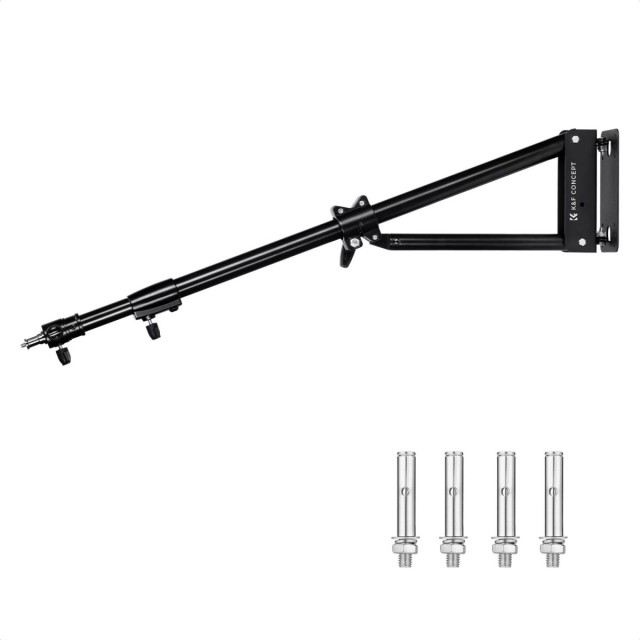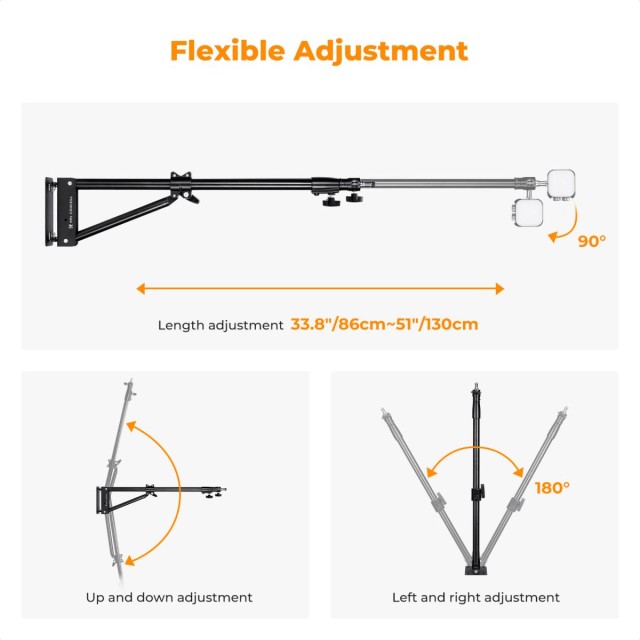 Podaljšljiv ročaj omogoča 180° vertikalno in 180° horizontalno vrtenje, kar omogoča nastavitev pod različnimi koti. Ročaj se lahko zloži neposredno ob steno, da se prihrani prostor. Idealno je za namestitev fotografskih luči, nadzornih naprav ali monitorjev. Omogoča kompleksno pozicioniranje, kot so nagibanje, vrtenje in podaljševanje.