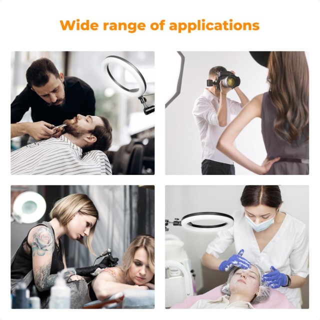 Stativ je opremljen s standardnim adapterjem za vijake 1/4" do 3/8", ki omogoča nemoteno priključitev različne lahke studijske opreme, vključno s kamero, pomožnimi svetilkami in mikrofoni. Zaradi široke združljivosti je idealen za uporabo v frizerskih salonih, tetovažnih studijih, kozmetičnih salonih, glasbenih studijih, fotografskih studijih in za neposredno predvajanje.