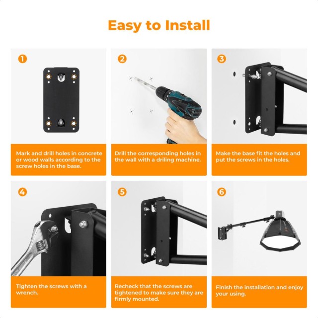Varno se pritrdi na steno in se, ko ni v uporabi, zloži na kompaktnih 93,5 cm (36,8"), s čimer sprosti dragocen prostor na tleh in ohranja red v studiu. Rokav se lahko vrti za 180° navpično in 180° vodoravno, kar omogoča raznoliko nastavljanje kota. Ko ga ne uporabljate, ga lahko zložite ob steno, da prihranite prostor. Idealno za pritrditev fotografskih luči, nadzornih naprav ali monitorjev, omogoča kompleksno pozicioniranje, kot so nagibanje, premikanje in podaljševanje.