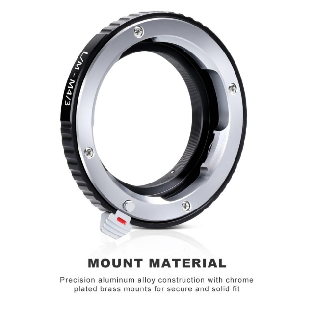 Z adapterjem za objektiv Leica M Mount za objektiv MFT sprostite vse možnosti svojega fotoaparata Micro Four Thirds (M4/3). Ta adapter omogoča nemoteno povezovanje objektivov z bajonetom Leica M z ohišji fotoaparatov Micro Four Thirds in s tem razširja združljivost objektivov. Adapter je združljiv s številnimi fotoaparati Micro Four Thirds, vključno s fotoaparati Panasonic Lumix ter Olympus PEN in OM-D, in je zasnovan za optimalno stabilnost in natančnost. Izdelan je iz medenine in aluminija, trpežna konstrukcija pa zagotavlja dolgotrajno delovanje. Ročno upravljanje omogoča ostrenje do neskončnosti, kar zagotavlja prilagodljivost pri fotografiranju. Za težje objektive srednjega formata je priporočljivo uporabiti teleobjektivni nosilec in stativ za optimalno ravnovesje. S tem vsestranskim adapterjem za objektive izboljšajte svojo fotografsko izkušnjo.