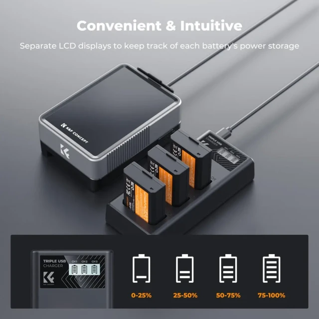 K&F Concept LP-E10 baterija, 3-pak in nadgrajeni LCD polnilnik. Polnilnik s tremi režami lahko hkrati učinkovito polni 3 baterije LP-E10, LCD zaslon pa jasno prikazuje stanje polnjenja vsake baterije.