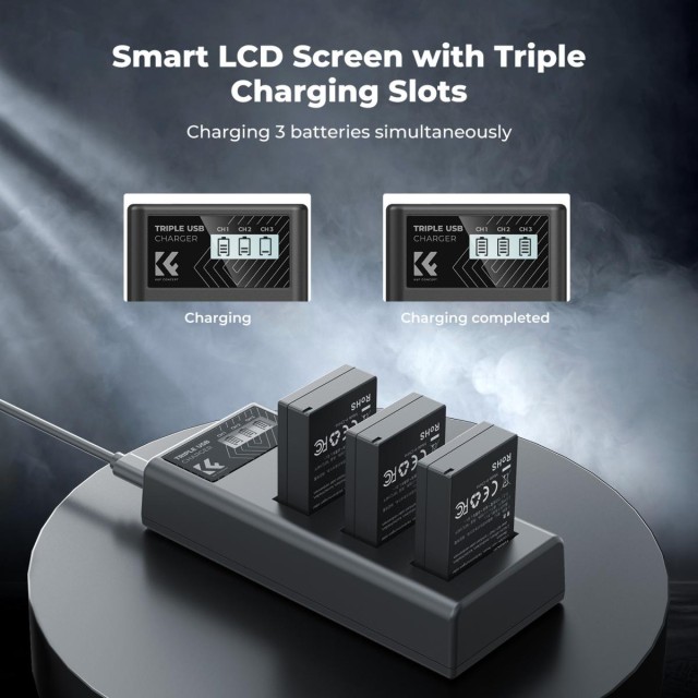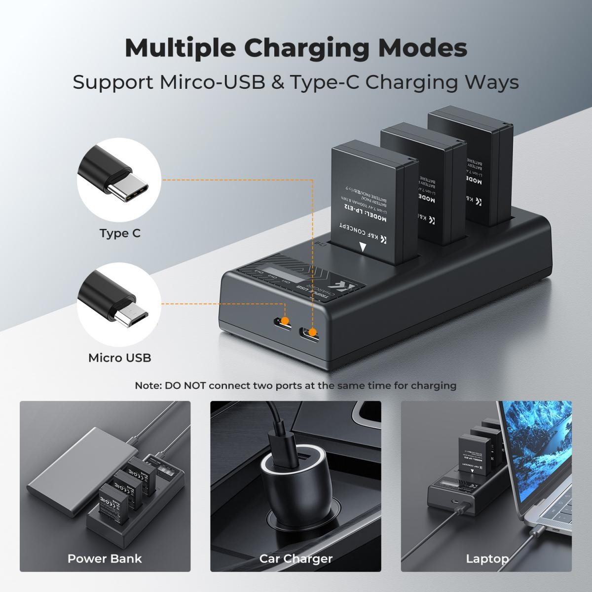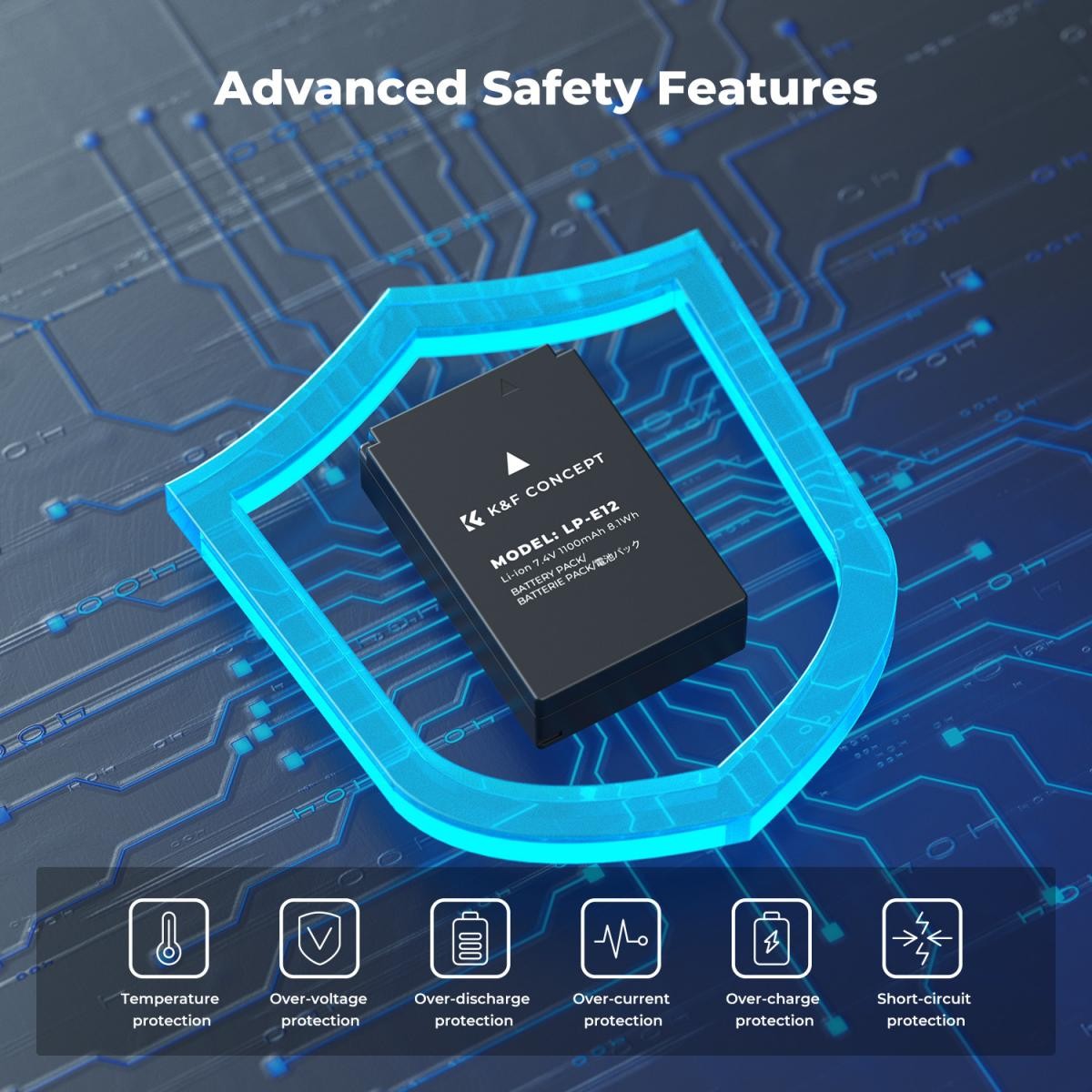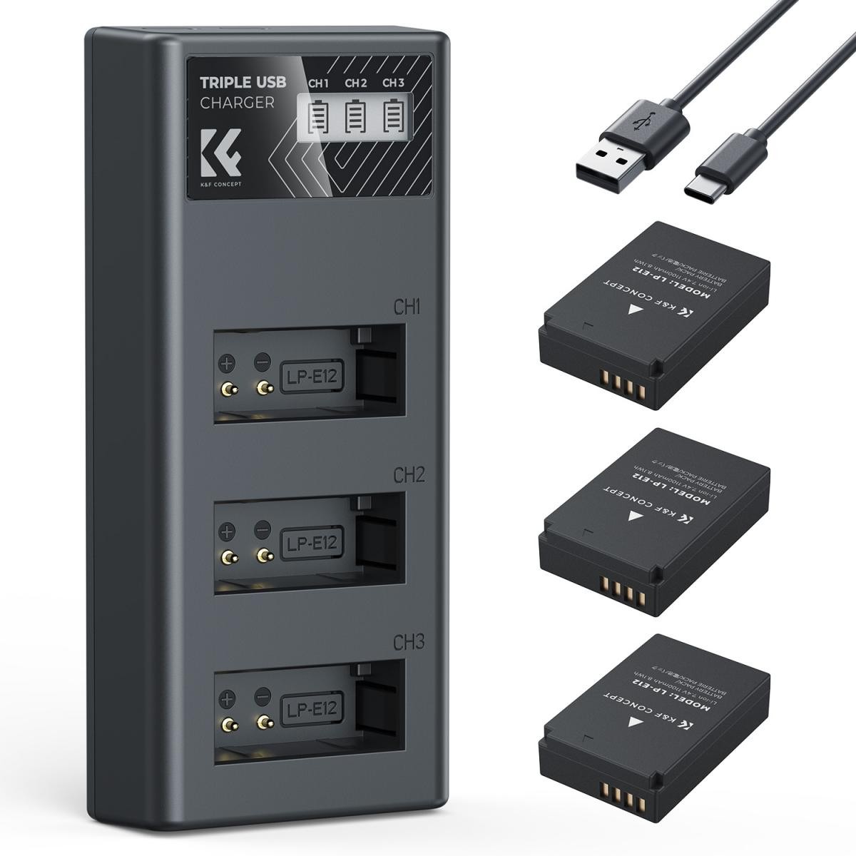 Komplet polnilnika baterij LP-E12 vključuje 3 baterije EOS M50 (nazivna zmogljivost 1100 mAh, 7,4 V, 8,8 Wh) in polnilnik z LCD-zaslonom s tremi režami, ki zagotavlja neprekinjeno napajanje za daljše fotografiranje. Polnilnik s tremi režami lahko hkrati učinkovito polni 3 baterije EOS M50, LCD-zaslon pa jasno prikazuje stanje polnjenja vsake baterije.