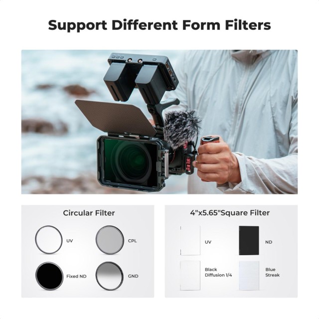 - * 【Vsestranski in varen sistem filtrov】Matte box lahko sprejme dva filtra debeline 4 mm v velikosti 4x5,65" in vključuje varen mehanizem za zaklepanje. Izpolnjuje potrebe snemanja v različnih scenah.