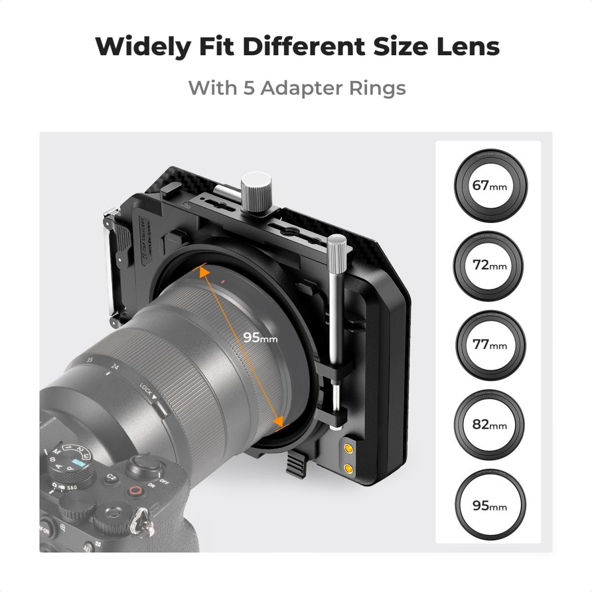 - * 【Vsestranska združljivost】Opremljen je s 5 adapterji (67/72/77/82/95 mm), ki ustrezajo večini DSLR in brez ogledalnih objektivov. Vključuje tudi več razširitvenih vrat (1/4", 3/8", hladna stopala) za namestitev dodatne opreme in še boljšo izkušnjo fotografiranja.