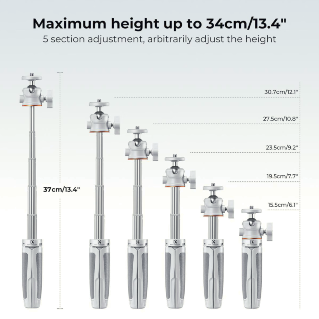 Podaljšljiv vrat omogoča nastavitev višine od 13 cm do 34 cm, kar zagotavlja večjo kreativno fleksibilnost za vse, od snemanja na mizi do višjih kotov za selfije. Visokokakovostni 360° kroglični spoj z 90° navpičnim nagibom zagotavlja gladko in natančno nastavitev kota, kar omogoča preprosto preklapljanje med vodoravnim in navpičnim načinom snemanja za vsebine na družbenih omrežjih.