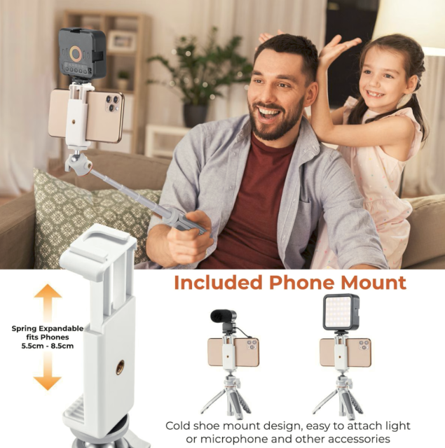 Priložena univerzalna plošča za pametne telefone je primerna za večino sodobnih pametnih telefonov in vašo napravo trdno pritrdi prek ¼-palčnega vijaka. MS02 je lahek, tehta le 154 g, zato ga je enostavno prenašati, ne da bi pri tem žrtvovali vzdržljivost. Za dodatno udobje je priložen daljinski upravljalnik Bluetooth, ki omogoča snemanje brez rok iz razdalje do 10 metrov – idealno za skupinske posnetke, vloganje ali preprečevanje tresenja kamere.