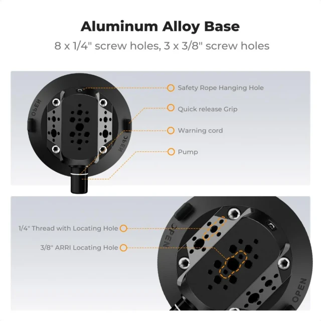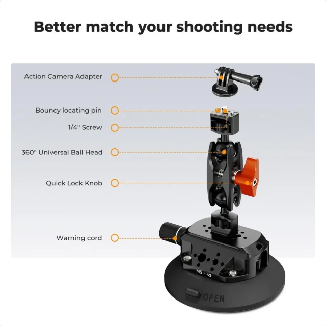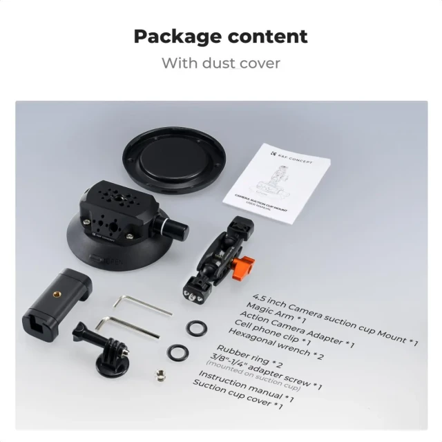 4.5-palčni nosilec kamere s priseskom in dvojno kroglasto glavo, nosilec za mobilni telefon, dodatki za GoPro adapter, 3/8-palčni do 1/4-palčni adapter vijak, MS45. Prijemalec ima več razširitvenih vmesnikov, z 1/4-palčnimi in 3/8-palčnimi vijaknimi luknjami in luknjami za pozicioniranje. Vrh nosilca ima 1/4-palčne teleskopske pozicionirne zatiče.