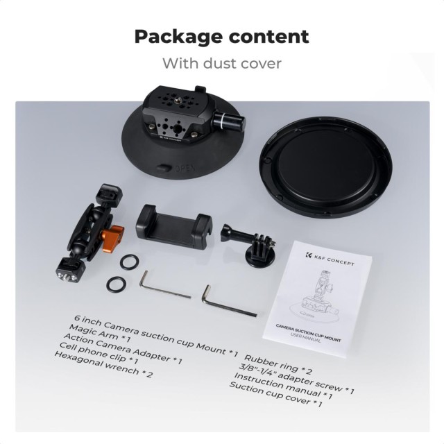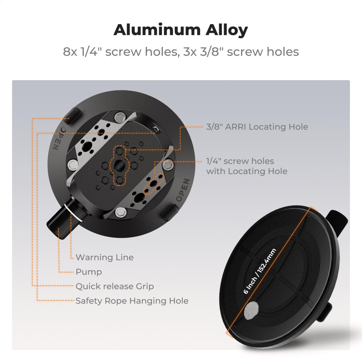 K&F Concept MS46 je vsestranski 6-palčni vakuumski prisesek, zasnovan za varno pritrditev na gladke površine, kot so avtomobilsko steklo, ploščice ali leseni paneli. Z 360° prilagodljivo nastavitvijo in več vijačnimi vmesniki podpira široko paleto naprav, vključno s fotoaparati, nosilci za mobilne telefone in osvetlitveno opremo, ter zagotavlja stabilne in prilagodljive snemalne kote za fotografijo in videografijo.