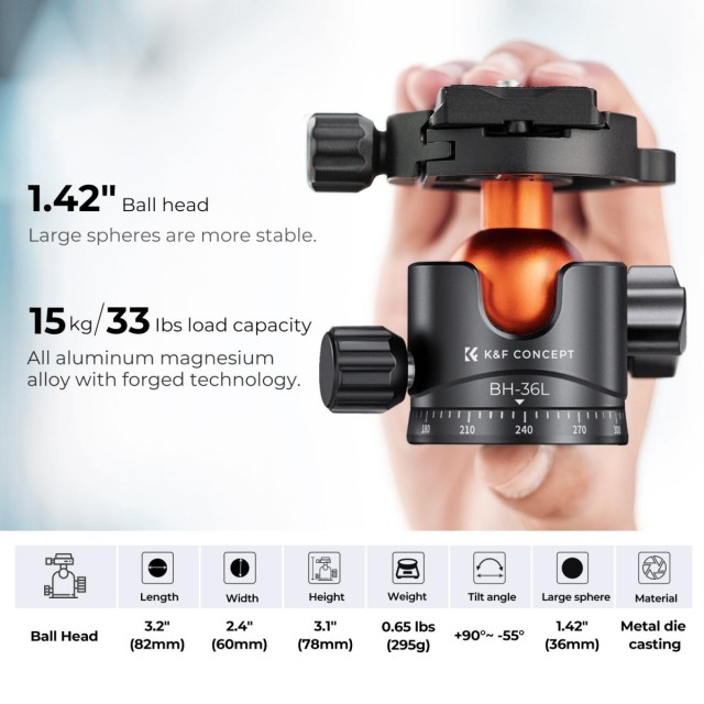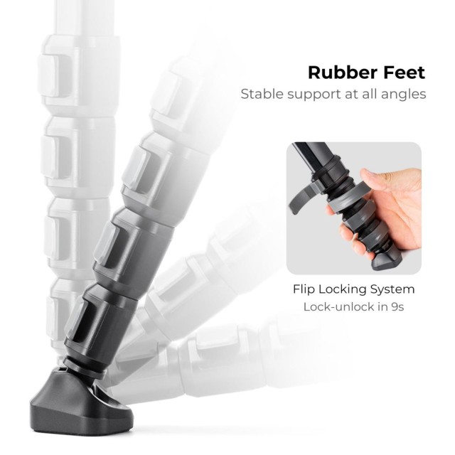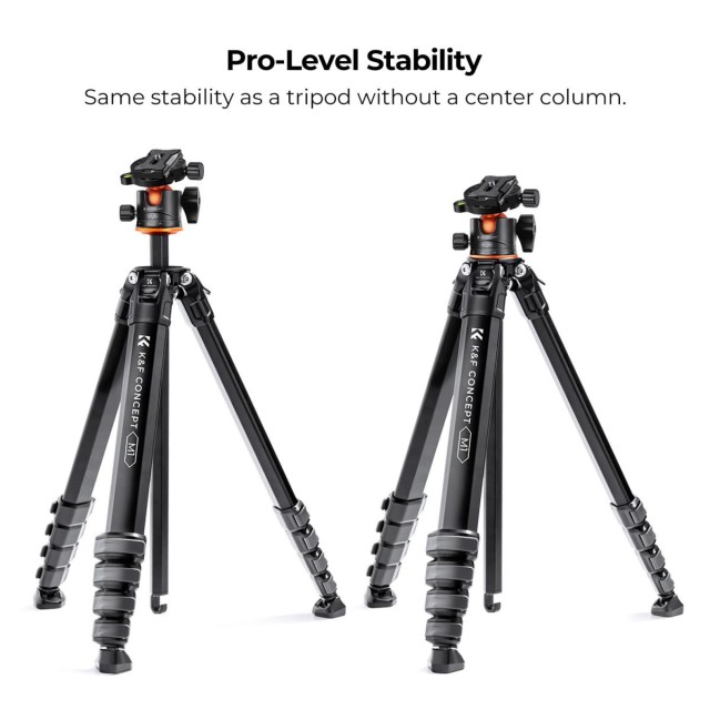 Potovalni aluminijasti stativ K&F Concept Mutate Series ima kompaktno in prenosno ohišje, saj je njegova velikost manj kot 500 mm/20", in je izjemno lahek - 1819 g/4 kg. Premer zloženega stativa je manjši od prostornine običajne steklenice za vodo. Kompaktna zasnova stativa omogoča, da ga zlahka spravite v vsako torbo za fotoaparat ali prtljago, ne glede na to, ali gre za potovanje ali delo. Da bi zagotovili enako stabilnost stativa kot pri stativu brez sredinskega stebrička, je stativ zasnovan z vgrajeno zaklepno osnovo, tako da je mogoče noge stativa tesno zakleniti in zagotoviti neverjetno stabilnost na profesionalni ravni.