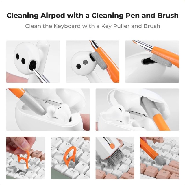 Komplet vključuje 11 osnovnih čistilnih pripomočkov, vsak prilagojen za določeno nalogo. Teleskopska krtača in dolga krtača učinkovito odstranjujeta prah z velikih površin, kot so tipkovnice in prenosni računalniki, medtem ko izvleček tipk omogoča enostavno odstranjevanje tipk za temeljito notranje čiščenje. Za podrobno delo so spominske gobice, krtača z visoko gostoto in konica čistilnega peresa idealne za čiščenje etuij za slušalke, zvočnih odprtin, vrat in ozkih kotov.