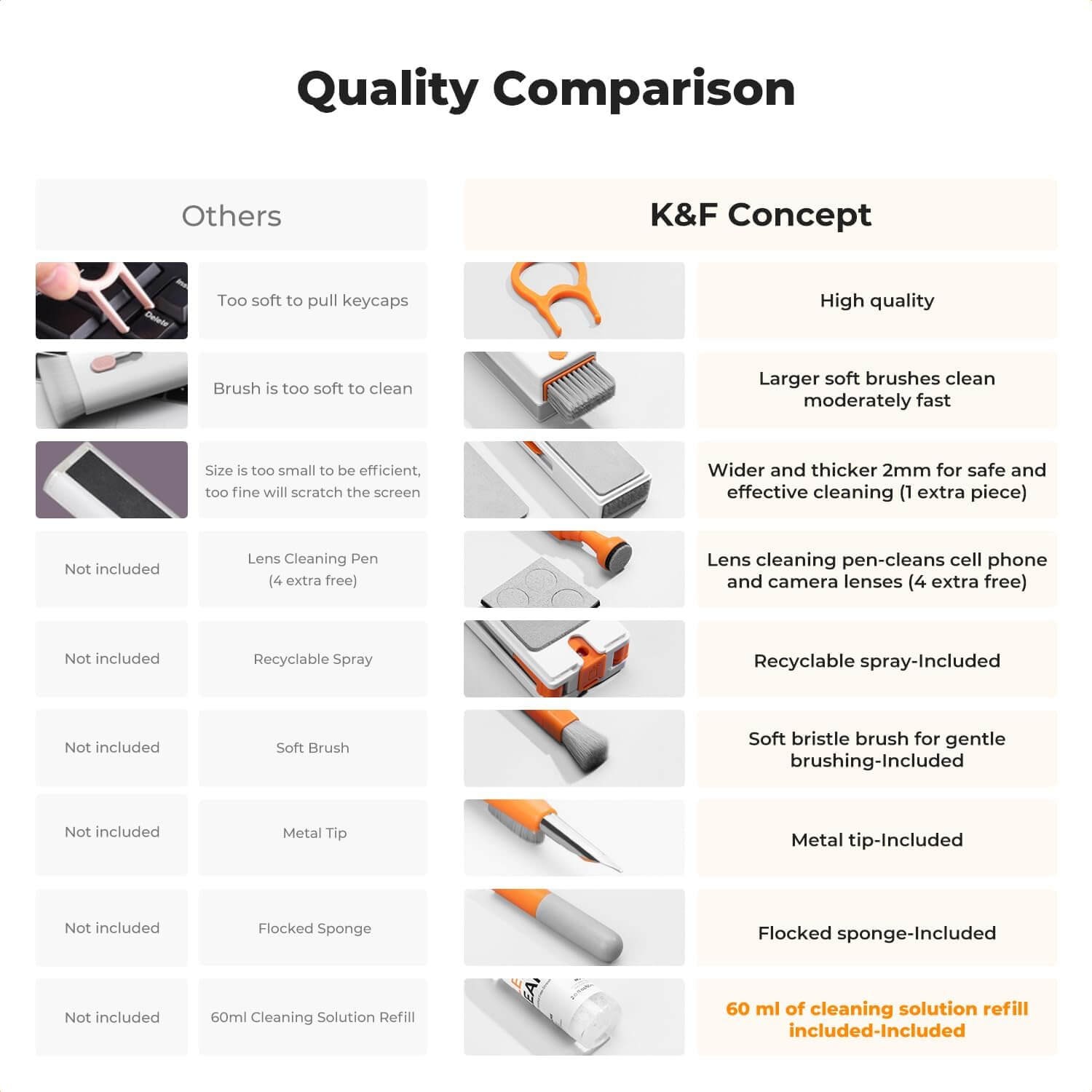Z kompletom za čiščenje elektronike K&F CONCEPT 11 v 1, ki je premišljeno zasnovan kot vsestranska rešitev za čiščenje za sodobne uporabnike tehnologije, bodo vaše naprave videti in delovati kot nove. Ne glede na to, ali čistite zaprašeno tipkovnico, zamazan zaslon pametnega telefona, objektiv kamere ali brezžične ušesne slušalke, ta nadgrajeni komplet zagotavlja natančnost, varnost in udobje.