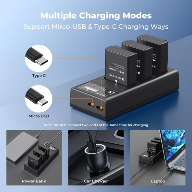 Komplet vključuje polnilnik baterij z 3 režami in LCD-zaslonom, ki omogoča hkratno polnjenje treh baterij, pri čemer na jasnem LCD-zaslonu prikazuje stanje polnjenja vsake baterije. Polnilnik podpira dvojni vhod prek Micro USB ali Type-C (5 V/2,1 A), zaradi česar je združljiv z napajalniki za steno, avtomobilskimi polnilniki, prenosnimi računalniki in drugimi USB-viri napajanja. Z uporabo vhoda Type-C se vse tri baterije lahko v celoti napolnijo v približno 3,8 urah.