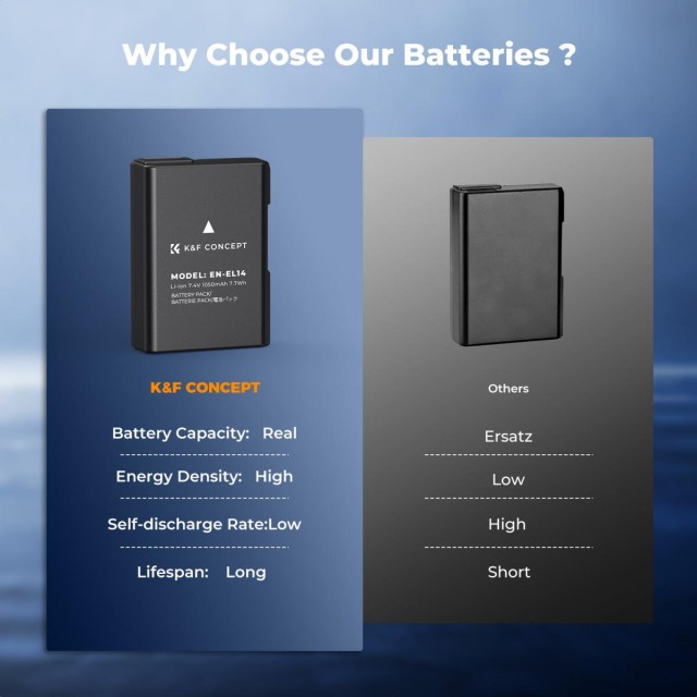 Komplet baterij K&F Concept Nikon EN-EL14 vsebuje 3 baterije EN-EL14/EN-EL14a z visoko zmogljivostjo 1050 mAh, 7,4 V, ki zagotavljajo dolgotrajno napajanje za neprekinjeno fotografiranje s fotoaparati Nikon. Združljiv z modeli, vključno z D5600, D5500, D5300, D5200, D5100, D3500, D3400, D3300, D3200, D3100, Coolpix P7000/P7100/P7200/P7700/P7800 in drugimi napravami , ki jih poganja EN-EL14.