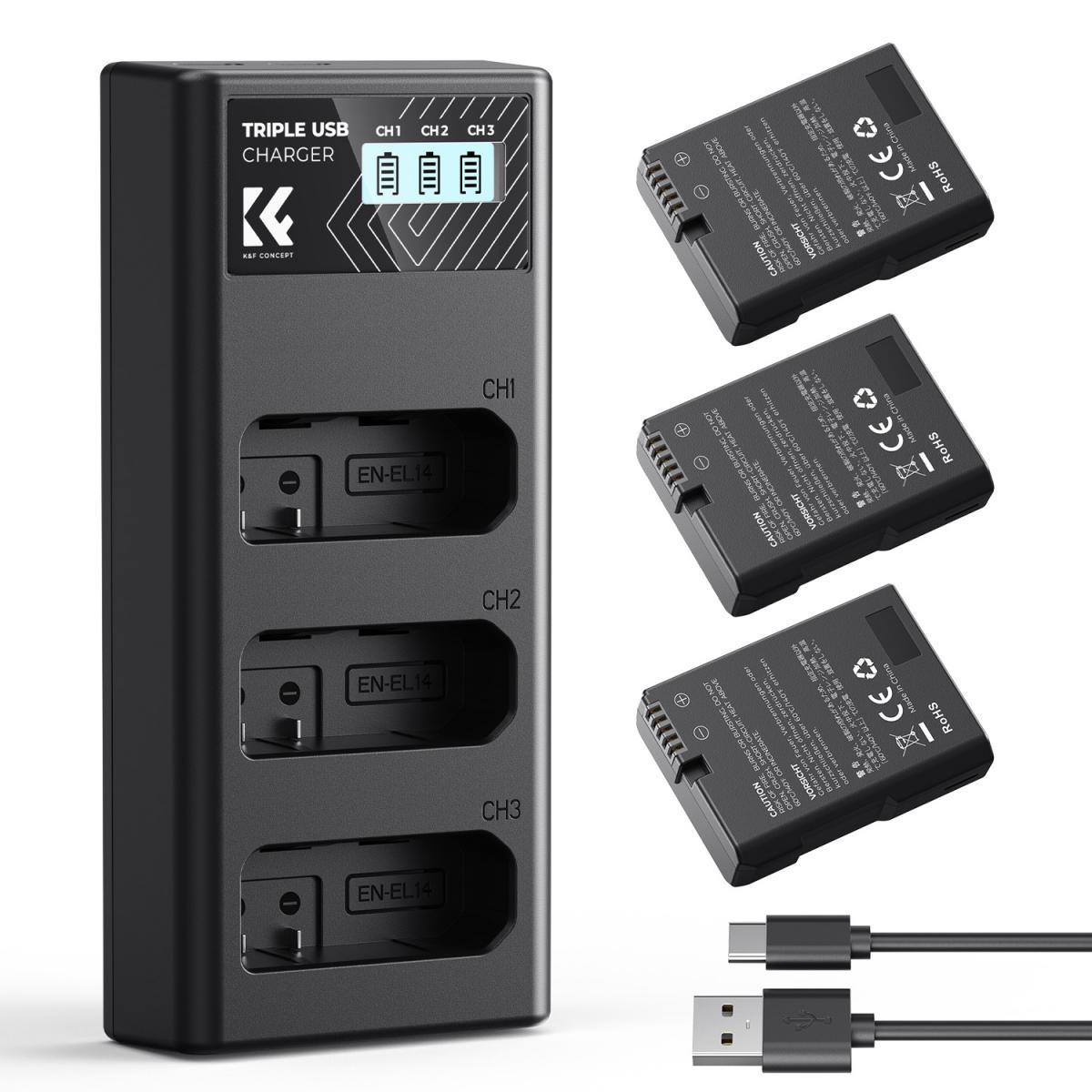 K&F Concept 3-pak Nikon EN-EL14 baterije za fotoaparate s 3-režnim LCD polnilnikom. Vključuje 1050mAh EN-EL14 baterije in LCD polnilnik z dvojnim Micro USB/Type-C vhodom za hitro in varno polnjenje.