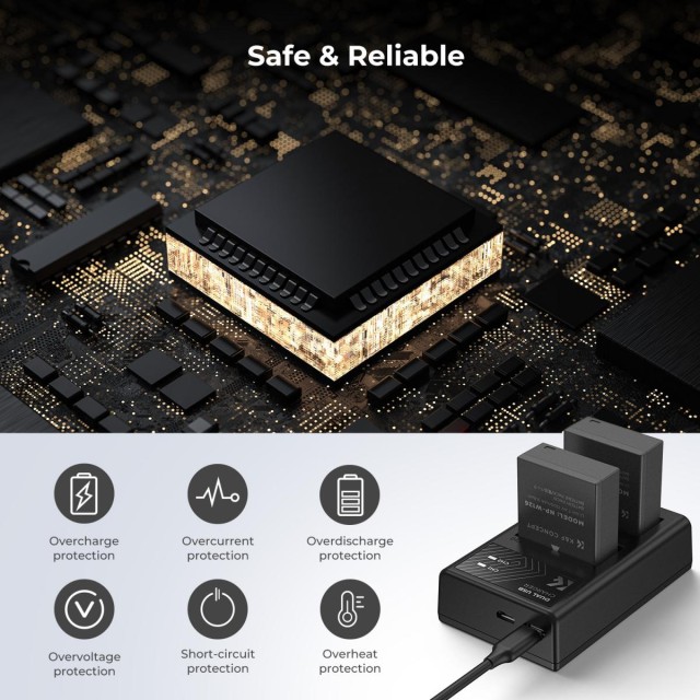 Komplet K&F CONCEPT NP-W126 Dual Battery Kit vključuje dve visokokapacitetni nadomestni bateriji 1300 mAh in polnilnik z dvema režama, ki zagotavlja zanesljivo in dolgotrajno napajanje za združljive fotoaparate Fujifilm. S podporo za polnjenje prek Micro-USB in USB-C ter vgrajenimi varnostnimi zaščitami je ta komplet idealen za fotografe, ki potrebujejo prilagodljivo in zanesljivo napajanje na poti.