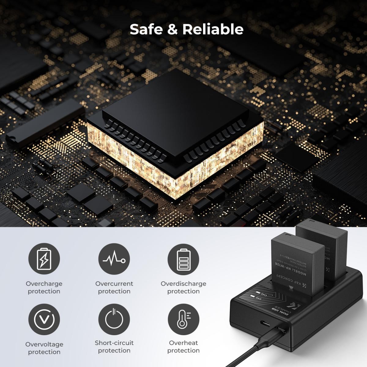 Polnilnik in baterije so opremljeni z inteligentnim varnostnim sistemom, ki vključuje zaščito pred prekomernim polnjenjem, pregrevanjem, prenapetostjo, prenapetostjo in kratkimi stiki, kar zagotavlja varno in zanesljivo delovanje, kjerkoli snemate.