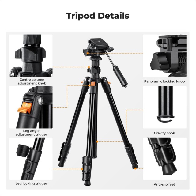 Stativ združuje funkcionalnost in prenosljivost, z 4-delno zasnovo nog, njegova maksimalna višina pa lahko doseže 196 cm. Po razstavitvi glave se stativ lahko zloži nazaj, njegova velikost v zloženem stanju pa je le 43 cm, tako da ga je mogoče enostavno shraniti v nahrbtnik ali torbo za fotoaparat.