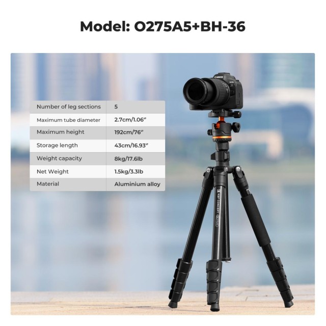 K&F CONCEPT O275A5+BH-36 je vsestranski teleskopski stativ z odstranljivim monopodom, zasnovan za fotografe in ustvarjalce vsebin, ki potrebujejo stabilnost, prilagodljivost in široko združljivost z napravami. Robustna 36-milimetrska kroglasta glava, noge s flip-lock zapahi in prenosna zasnova ga naredijo idealnega za snemanje s pametnimi telefoni, tablicami, brezzrcalnimi fotoaparati in DSLR-ji.