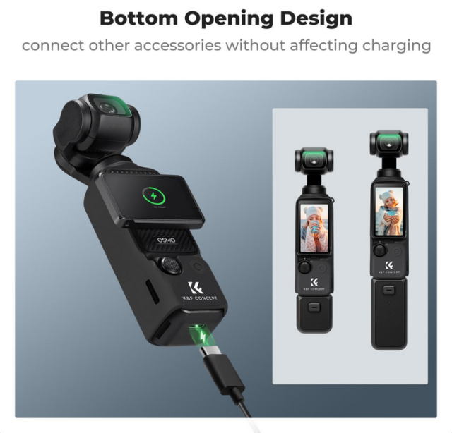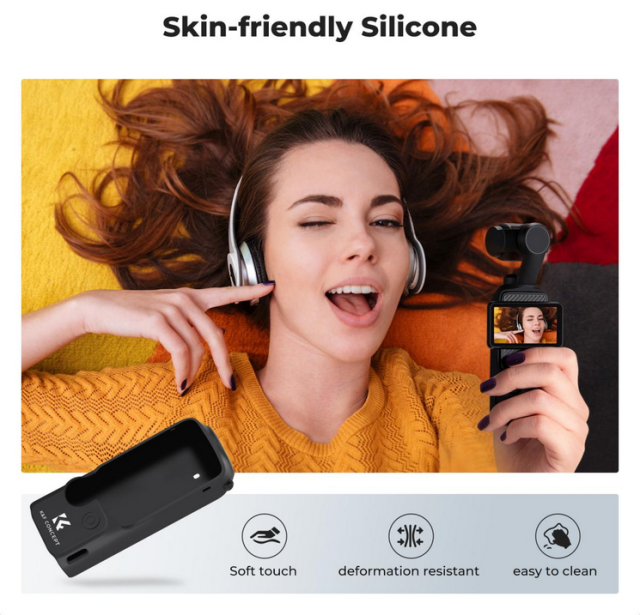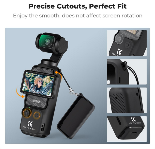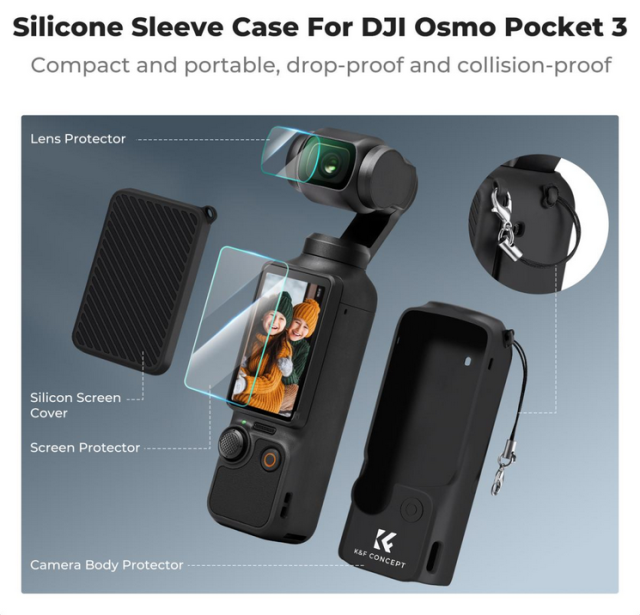 Komplet silikonskih zaščitnih prevlek K&F CONCEPT Pocket 3 je zasnovan za optimalno zaščito in funkcionalnost, saj vsebuje trpežno silikonsko prevleko za ohišje, protieksplozijsko zaščito zaslona iz kaljenega stekla in priročne funkcije proti izgubi dodatkov za fotoaparat.