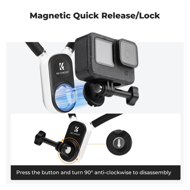- * 【180° prilagodljiv kot in enostavna uporaba】 Nagibni nosilec omogoča nastavitev do 180°, medtem ko 360° J-palica prilagaja kot za navpično/vodoravno snemanje. Idealen za vloge, treking ali snemanje na poti z dinamičnimi in ustvarjalnimi perspektivami; magnetni nosilec kamere omogoča hitro sprostitev ali zaklepanje traku. Pas se lahko varno zaklene z vrtenjem za 90° v smeri urinega kazalca. Za odklepanje pritisnite gumb za hitro sprostitev (puščica navzdol) in zavrtite za 90° v smeri urinega kazalca.