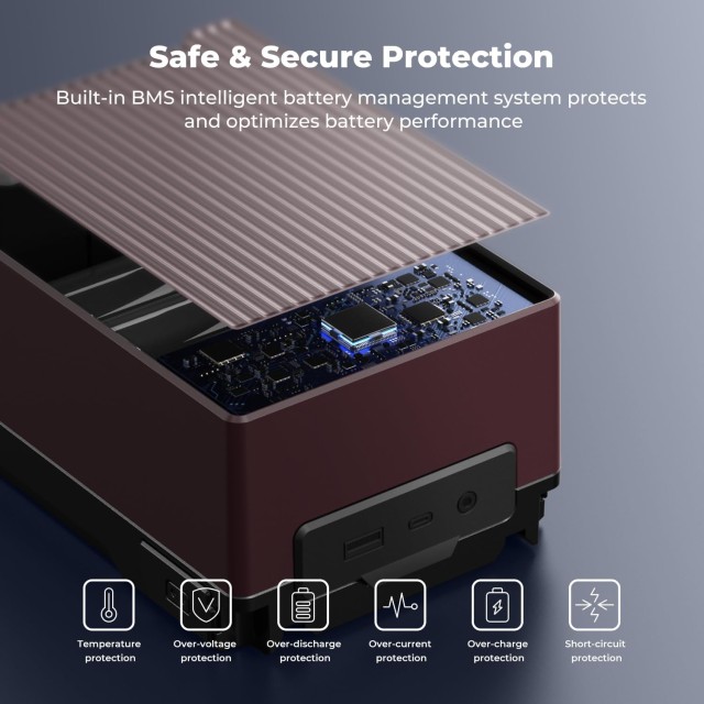 Varno in zanesljivo: baterija V Mount uporablja visokokakovostne baterijske celice znanih blagovnih znamk, inteligentni sistem BMS pa zagotavlja več zaščit, vključno z zaščito pred prenapetostjo, kratkim stikom, pregrevanjem in prenapetostjo